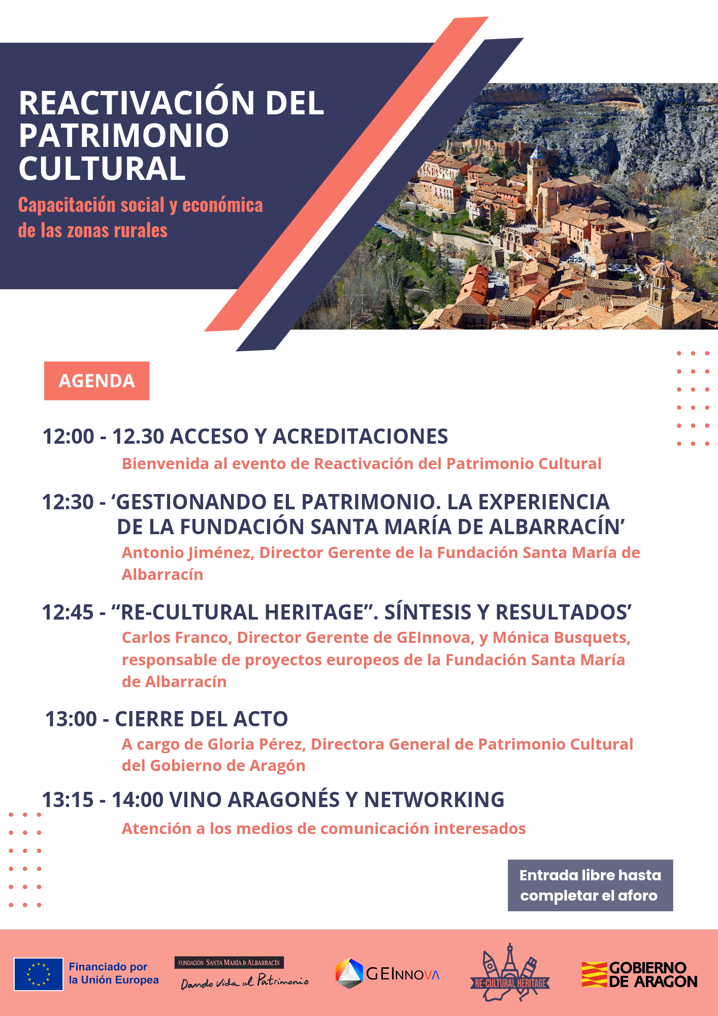 Re-cultural heritage Spanish partners Geinnova and the project coordinator, Fundación Santa María de Albarracín, are pleased to announce the MULTIPLIER EVENT in Spain, a unique opportunity to meet cultural heritage stakeholders, professionals, administration representatives, youth, and the local community, to discuss the usage of the cultural heritage as a tool for rural areas dynamization, employment promotion, sustainable tourism, through education, capacity-building activities to improve skills and best practices.